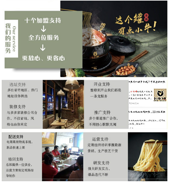 小牛罐米线店创立至今,短短半年,以其独特的口感和精美包装,以及适用于各年龄段的原材料受到顾客一致好评,迅速占领市场份额,成为餐饮市场的新起之秀,加盟店也如雨后春笋