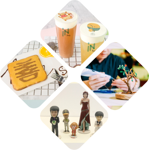 善印师创新茶饮产品组合3D打印奶盖茶+松软打印饼+3D个性定制+ 3D打印课程及活动。四店合一,一份投资四份回报。
